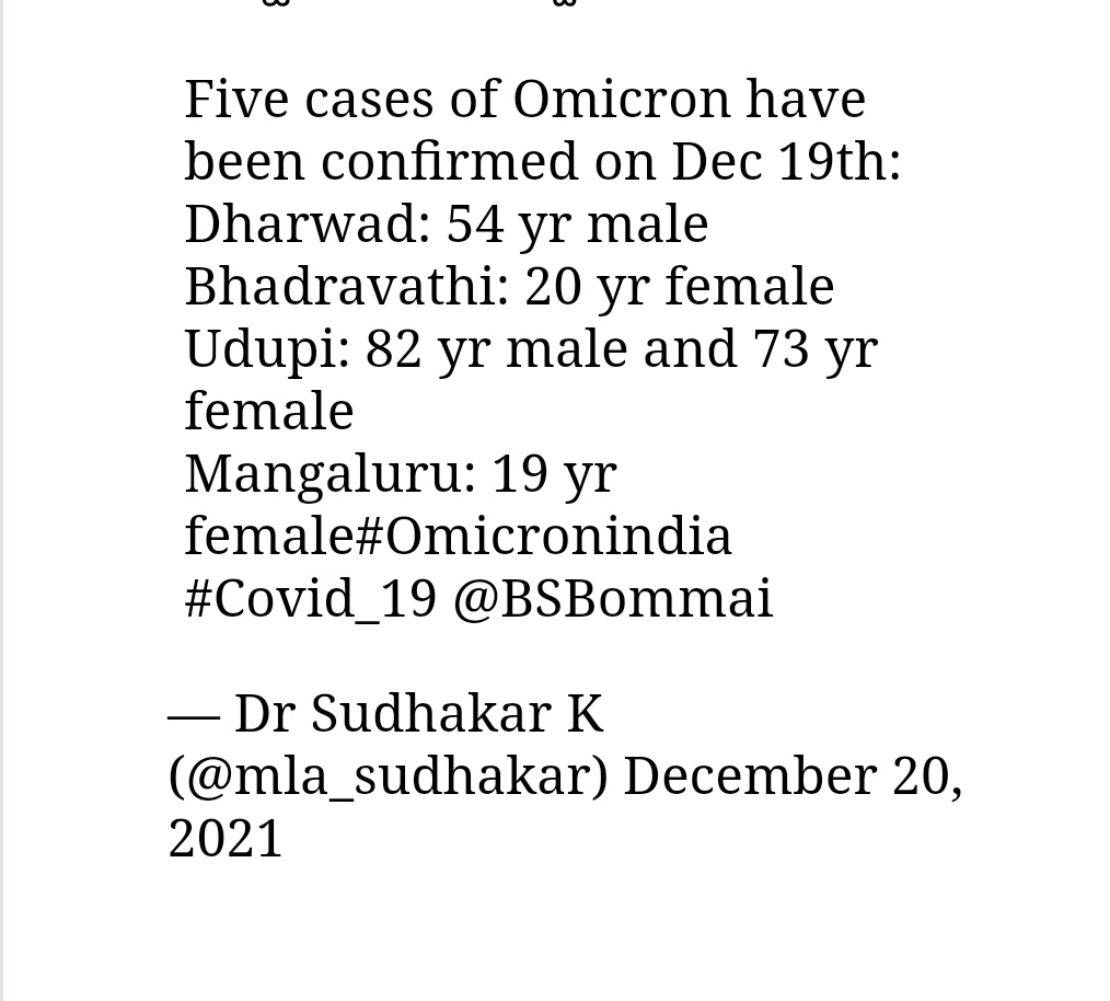 ریاستی وزیر صحت نے ایک ٹویٹ میں انفیکشن پائے جانے کی تصدیق کی جسکے بعدڈسٹرکٹ ہیلتھ اینڈ فیملی ویلفیئر آفیسر نے میڈیا میں اسکی تصدیق کی ۔متاثرہ طالب علم کے کیرل سے آنے کے بعد کوئی سفری تاریخ نہیں ہے۔ اس وقت ریاست میں جملہ پانچ معاملات کی نشاندہی ہوئی ہے ۔۔ واضح ہوکہ اومیکرون بیماری زیادہ متاثر کرنے والی بیماری میں شمار نہیں کیا جارہا ہے اور نہ ہی اس میں ہلاکتوں کی شرح زیادہ ہے باوجود اسکے حکومت اور میڈیا میں جیسے خوف پھیلایا جارہا ہے وہ تعجب خیز بات ہے۔