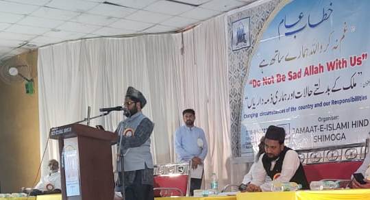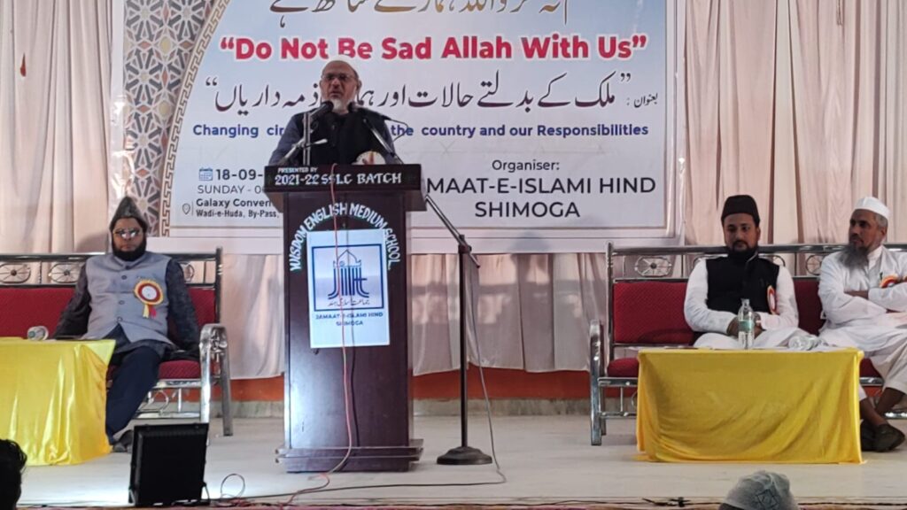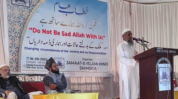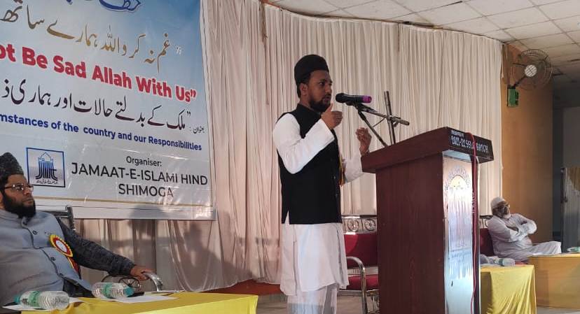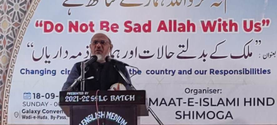 جلسے کی صدرارت کرتے ہوئے جماعت اسلامی ہند کے ریاستی صدر ڈاکٹر سعد بلگامی نے صدارتی کلمات پیش کرتے ہوئے کہا کہ مسلمانوں کو چاہئے کہ وطن کی فکرکریں، افسوس کی بات ہے کہ چند فیصد لوگ ملک کے حالات کو بگاڑرہے ہیں۔ کچھ فتنے برپانے والے کچھ ہی لوگ ہوتے ہیں لیکن اسکا اثر سب پر پڑتاہے۔ یہ ملک مختلف شعبوں،زمروں ،زبانوں اور مذاہب کا ملک ہے لیکن یہاں ہندوتوا کو قائم کرنے کی کوشش کی جارہی ہے۔ جو دستور ہمیں دیا گیاہے اس کے تقاضے کو سمجھتے ہوئے اس ملک کو بچانے کی کوشش کرنی چاہئے ۔ اس وقت مسلمانوں کے خلاف اسلاموفوبیا کا طوفان جو برپا ہے ایسے حالات میں ہمیں ثابت قدم رکھنے کی ضرورت ہے۔ مسلم نوجوانوں میں حوصلہ پیدا کرنے اوراشتعال و گمراہ ہونے سے بچانے کی ضرورت ہے۔ مسلمانوں کو موجودہ حالات پر ٹھنڈے طور پر سوچ سمجھ کر کام کرناچاہیے۔ ہم امت مسلمہ ہیں اور ہمارے ذمہ ساری دنیا کو اللہ کی کتاب سے روشناس کرانے کی ذمہ داری ہے۔ یہ مشکلات آنے والی آسانیوں کولانے کی نشانی ہے۔ جب بھی ہم اپنی غلطی کو پہچانااور اسے سدھارا تو ہمارے لئے راہیں آسان ہوجاتی ہیں۔ جو اللہ پر توکل کرتے ہیں اللہ انکے لئے کافی ہے۔ اس وقت فرقہ پرستوں کے خلاف متحدہونے کی ضرورت صدر جلسہ ڈاکٹر سعد بلگامی نے محسوس کی۔