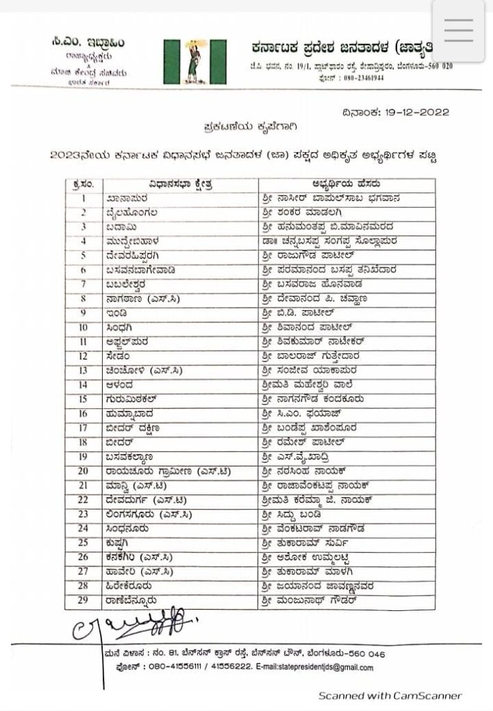 بنگلورو:۔کرناٹک کے اسمبلی انتخابات کیلئے جے ڈی ایس نے اپنے امیدواروں کی پہلی فہرست جاری کی ہے۔جاری کردہ فہرست میں کئی نئے نام بھی شامل ہیں۔آج پارٹی کے قومی صدر ایچ ڈی دیوے گوڈاکی منظوری کے بعد پارٹی کے ریاستی صدر سی ایم ابراہیم نے یہ فہرست جاری کی۔اس تعلق سے پارٹی کے لیڈر ایچ ڈی کمارسوامی نے ٹوئٹ کرتے ہوئے فہرست کا خلاصہ کیاہے۔جملہ89 اسمبلی حلقوں کیلئے فہرست جاری کی گئی ہے،جس میں 6 مسلم امیدواروں کوبھی ٹکٹ دی گئی ہے۔مسلم امیدواروں میں ناصربابل صاحب بھگوان،کھانہ پور،سی ایم فیاض،ہمناآباد،ایس وائی, قادری ،بسواکلیان ،امان اُللہ،داونگیرے سائوتھ،محید الطاف،ہیبال شامل ہیں،جبکہ شیموگہ ضلع کیلئے بھدراوتی سے شاردا پاجی گوڈا،شیموگہ رورل سے شارداپوریا نائک،تیرتھ ہلی سے راجا رام شامل ہیں،ساگر،شکاری پور،شیموگہ اربن اور سورب سے کسی بھی امیدوار کا نام ابھی تک طئے نہیں کیاگیاہے۔