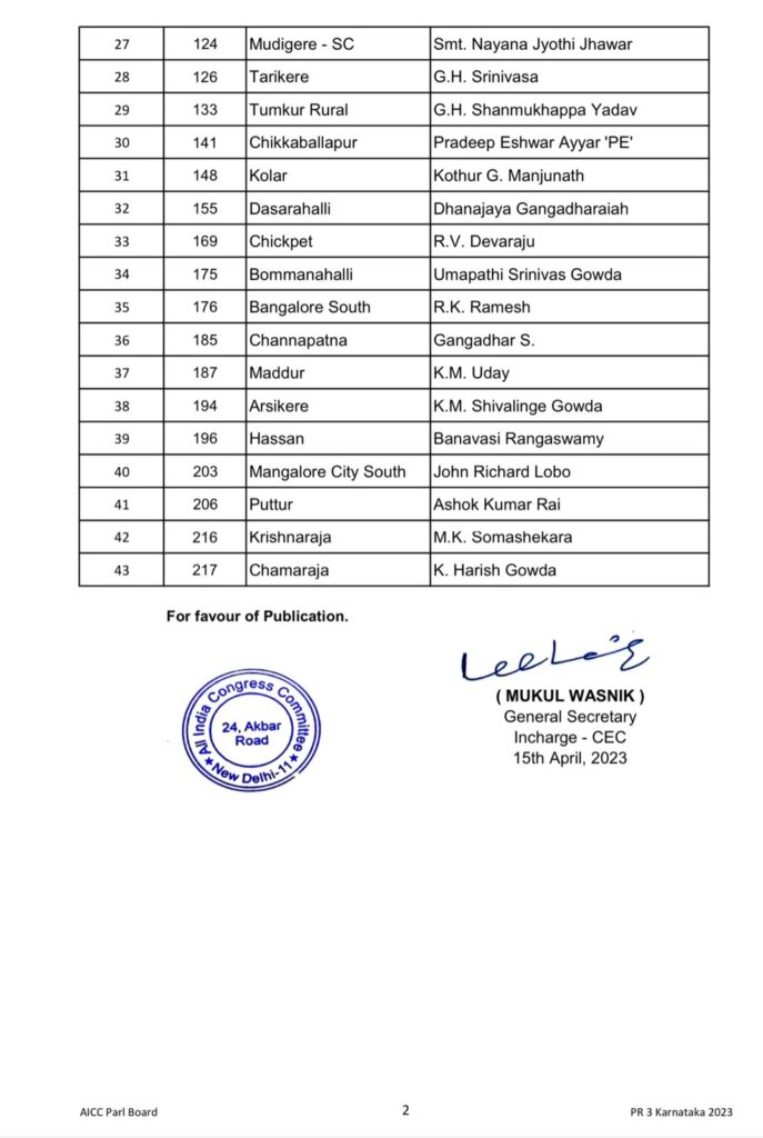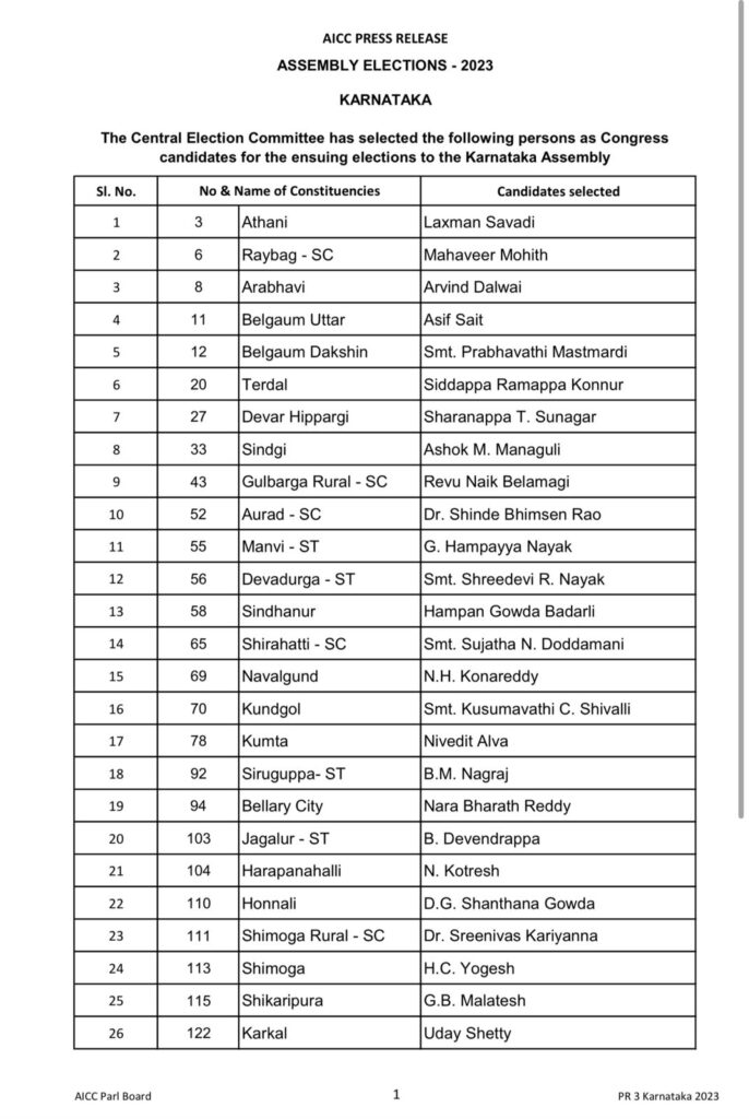 اسمبلی انتخابات : کانگریس نے جاری کی تیسری فہرست: شیموگہ سے ہیچ سی یوگیش، رورل حلقے سے سرینیواس کرینا ; یس ڈی پی آئی کی بھی ہلچل